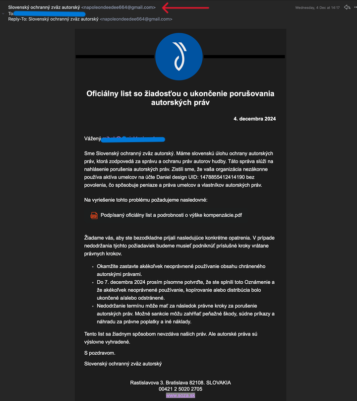 Podvodný odosielateľ vystupuje v mene SOZA a adresátov upozorňuje na nesplnené pohľadávky a porušenie autorského zákona. Odosielateľom týchto emailov však nie je SOZA, a preto by ste nemali na takéto výzvy reagovať.