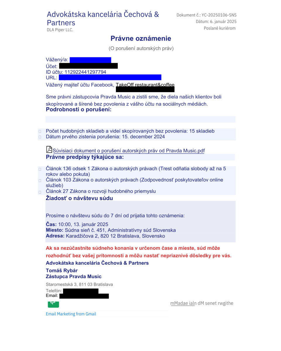 Špeciálne dávame do pozornosti podvodné emaily posielané v mene Advokátskej kancelárie Čechová & partners. Tieto emaily sú falošné a nie sú zasielané spomínanou advokátskou kanceláriou.